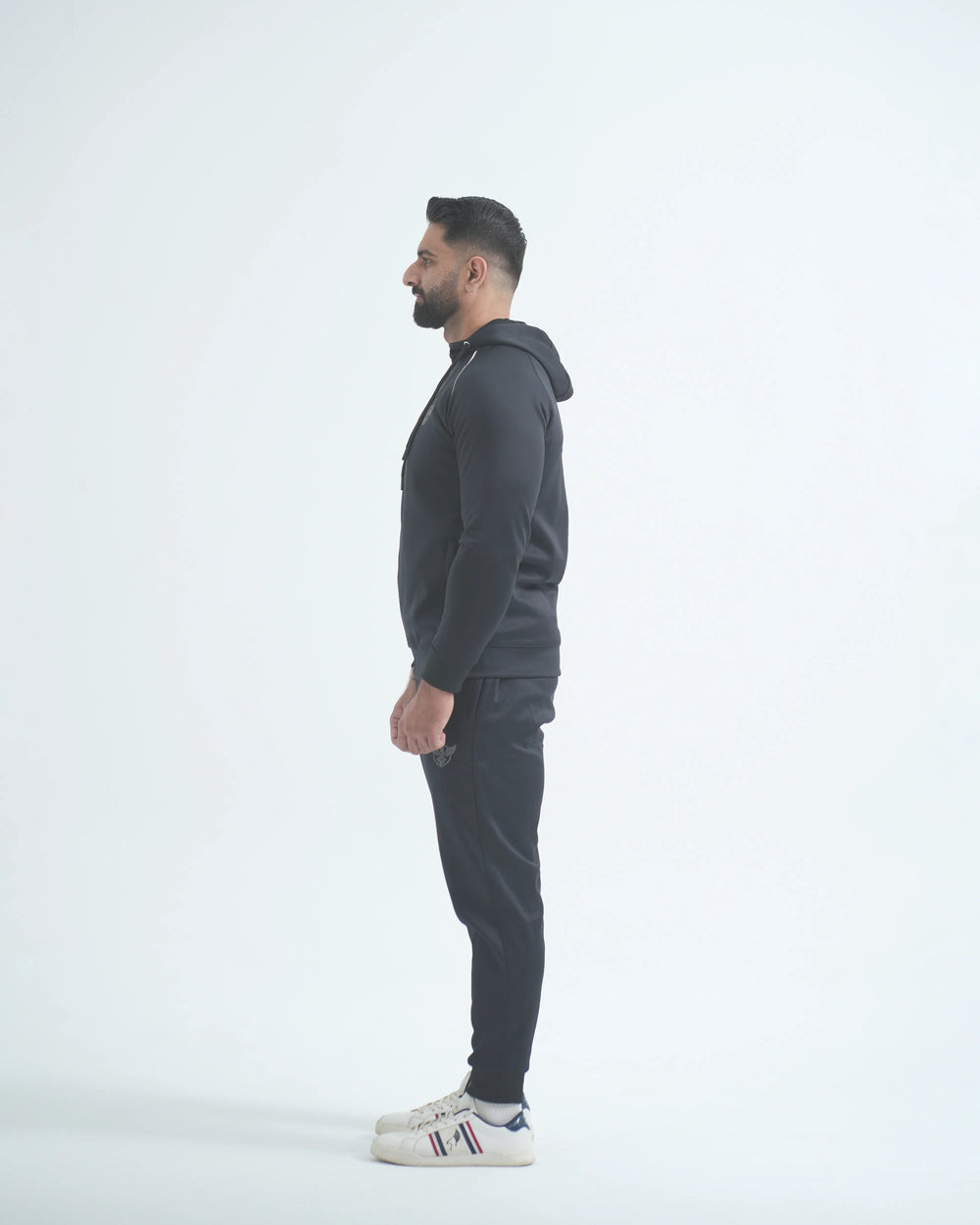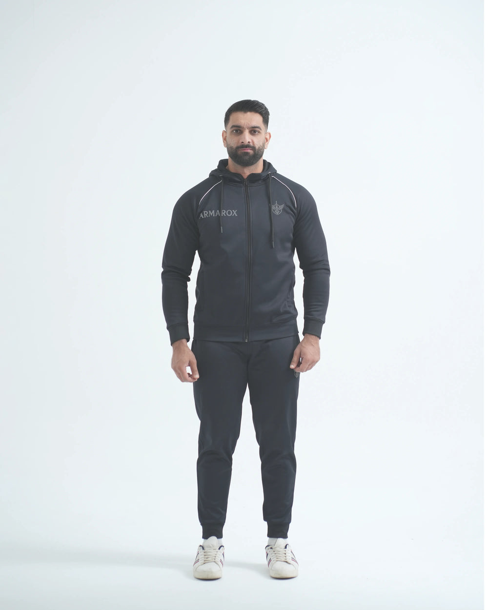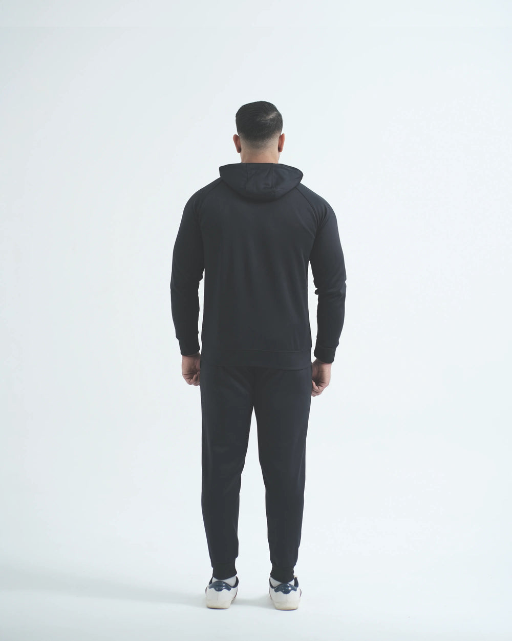 A timeless all-black tracksuit with a strong athletic feel. Sleek, minimal, and perfect for those who like a bold, no-nonsense look.