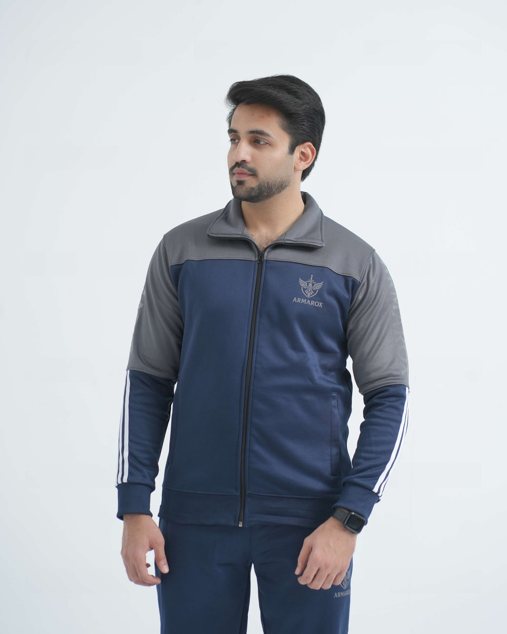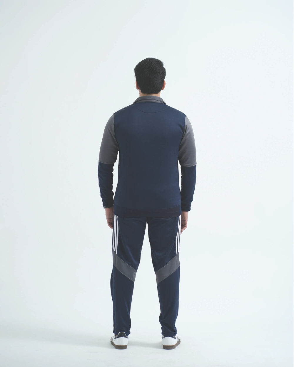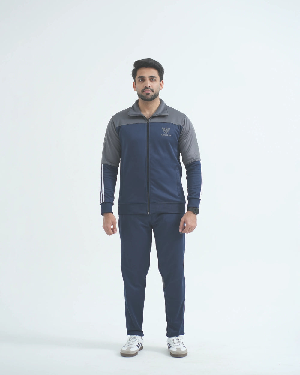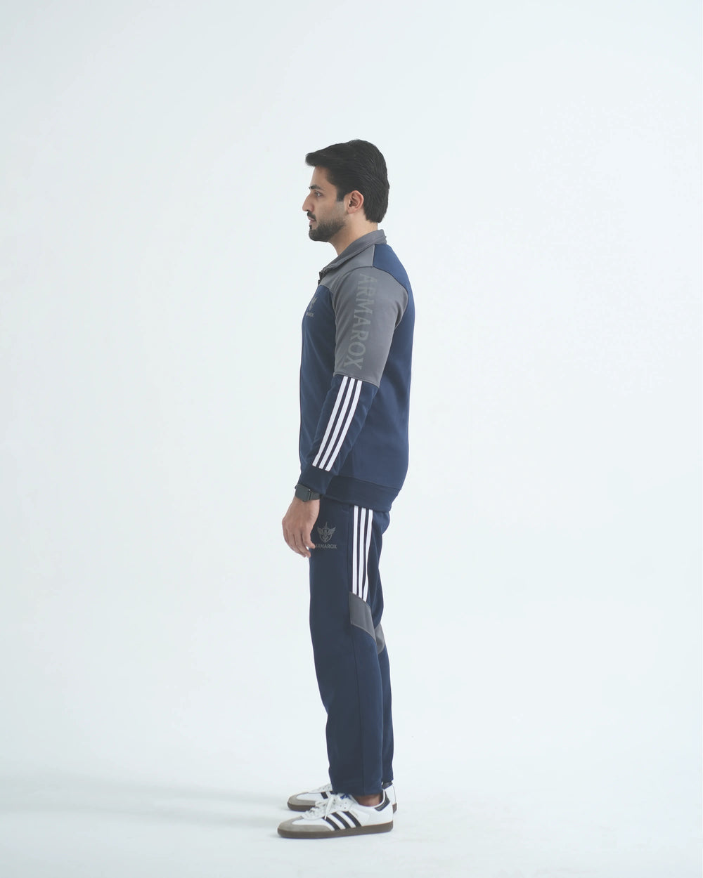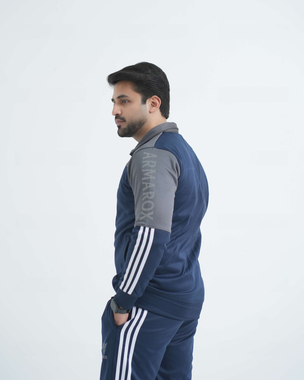 A navy tracksuit with grey shoulders for a stylish contrast. Sporty, comfortable, and built for everyday movement.